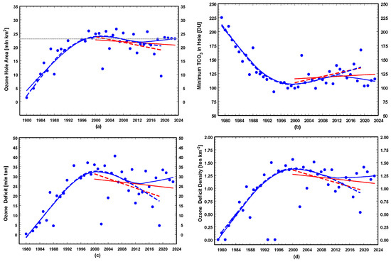 Time series of the annual SH polar ozone metrics (solid circles in blue) and straight lines showing standard least-squares fit to the 2000–2019 (dashed line in red) and 2000–2023 (solid line in red) data. The dashed curve and the solid curve (both in blue) show the smoothed patterns of the metrics for the periods 1980–2019 and 1980–2023, respectively. (a) Ozone hole area; (b) TCO3 minimum within SH polar cup; (c) mass of ozone deficit; (d) mass of ozone deficit per 1 km2 of the ozone hole.