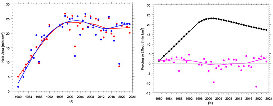 The hole area in 1998 was 25.8 million km2, exceeding 23 million km2 for the first time (see the reference line of 23 million km2 in Figure 4a). This also happened in the next three consecutive years (1999–2001), corresponding to the period of the EESC maximum in Antarctica. Another such case was found in the period 2020–2023.