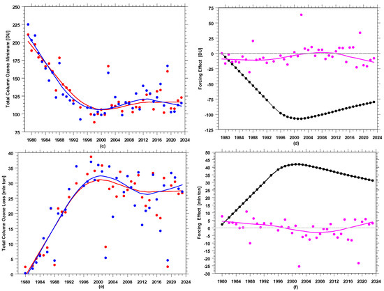 (left): Original time series (in blue) and time series modeled by the regression (in red) of the metrics for the period 1980–2023. Solid circles and the corresponding curves show the annual values and their smoothed patterns, respectively. (a) Hole area; (c) minimum of TCO3 within the SH polar cup; (e) mass of the ozone deficit. (right): Modeled forcing (annual values and their smoothed patterns) on the metrics by EESC (black) and superposition of non-EESC proxies (magenta, listed in Table 5). (b) Hole area; (d) minimum of TCO3 within the SH polar cup; (f) mass of the ozone deficit.