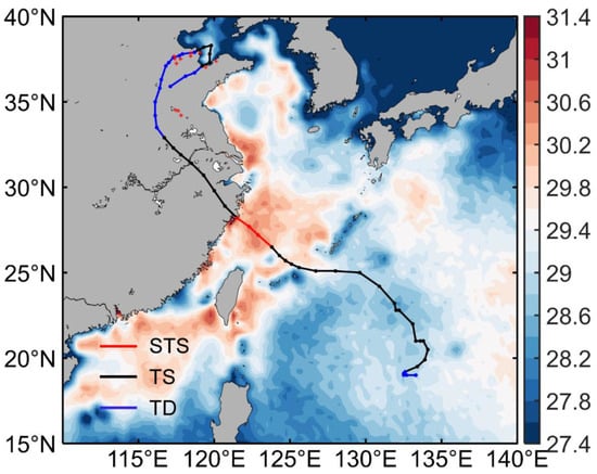 The oceans, as the fundamental factor determining the TCs’ intensification, provide the necessary energy and moisture for the deep convection and maintenance of TCs [10,11]. Previous studies have indicated that a SST in the range of 26~30 °C is conducive for the intensification of TCs, while the SST out of this range tends to slow down the TCs’ development [1,12]. Meanwhile, the presence of TCs, in turn, can influence the SST. The intense wind stress of TCs can spontaneously drive a cyclonic current pattern in the upper layer of the ocean, leading to the surface divergence and consequent upwelling of sea water, according to the Ekman pumping theory. Consequently, the colder deep water is pumped up to the sea surface, while the surrounding warmer water is sunk into the deeper ocean. Additionally, wind stress enhances the turbulent motion in the ocean, promoting a strong mixing of the surface and sub-surface waters. Under these influences, SST tends to decrease while the sub-surface temperature increases. As a result, the cooler SST inhibits the energy and moisture transported from the ocean towards atmosphere, which may suppress the TCs’ development and change the TCs’ path [13,14,15,16,17]. Besides warm SST, the oceanic mixed layer depth to 60 m is another overwhelming factor influencing the TCs [18,19], the thicker mixed layer promotes larger ocean heat content, which favors the energy and moisture transports from the ocean to the atmosphere, and thus leading to more intensified TCs [20].