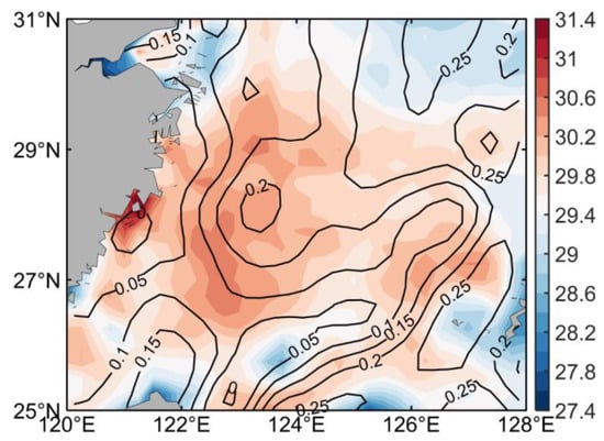 During the period of Yagi, there was an eddy with a sea surface height anomaly of 0.2 m over the eastern sea area of Zhejiang Province in the East China Sea (Figure 2). Under the influence of the closed eddy, a large area of high SST appeared over the East China Sea. Particularly on the western side of the eddy, SST reached 30.6 °C, which was more than 2 °C higher than SST in the Pacific east of Ryukyu Islands (Figure 1), due to the combined effects of horizontal and vertical flows. The anomalously high SST in the vicinity of the eddy resulted in an abnormally high heat flux from the ocean to the atmosphere. This contributed to the maintenance and development of the passing TC’s intensity.