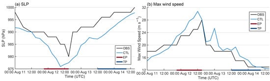 The changes of (a) MSLP and (b) MSWS of Yagi over the East China Sea and after landing. OBS: observation data; CTL: control run data; EP: eddy region period; TP: Tornado generation period.