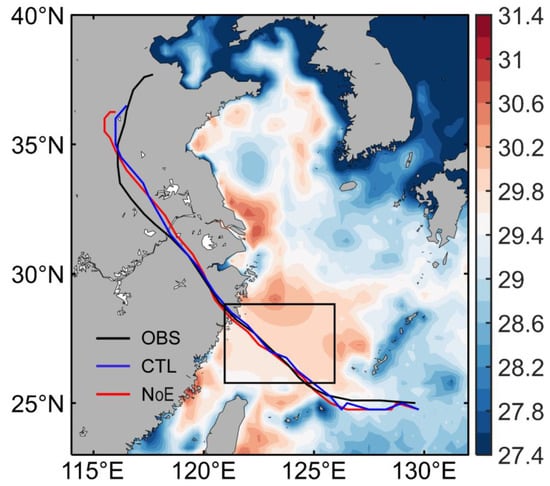 The track of TC and the smoothed SST (in black box, in °C) in the simulation results. OBS: observation data; CTL: control run; NoE: no eddy run.
