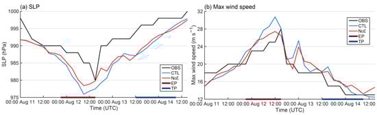 To investigate the impact of the eddy on the intensity changes of TC Yagi, this study designed sensitivity experiments (NoE) by smoothing the SST near the eddy in the initial field to remove the atmospheric responses of the eddy (for specific methods, see Section 2.2). After the smoothing process, the SST changes within the warm water area that TC passes are moderate, and the distinct SST fronts are no longer present. The SST anomalies caused by eddy are removed, as shown in Figure 4. Under such underlying surface conditions, the impacts of the eddy on the development of the TC are weakened. The results of NoE shows that the TC path is generally consistent with the CTL (shown in Figure 4), and the movement speed of TC remains basically unchanged. This indicates that the influences of the eddy on the path and the moving speed of the TC were relatively small. In terms of TC intensity, after the TC entered the region with smoothed SST, the MSLP (MSWS) continued to decrease (increase) rapidly, and the intensity of the TC increases (shown in Figure 5). However, after entering the core region of the SST anomalies, the development of TC intensity in the CTL significantly faster than the NoE (shown in Figure 5). At 12:00 UTC on 12 August, the TC intensity in both experiments reaches its maximum. In the NoE, the MSLP of the TC was 978 hPa, which was 2 hPa higher than the CTL, accounting for 20% of the pressure decrease in the CTL. MSWS in the NoE was 27 m s−1, which was 4 m s−1 lower than the CTL, accounting for 40% of the wind speed increase in the CTL. After TC landfall, the intensity of the TC in both runs were close. By comparing results in the CTL and the NoE, it can be found that the core area of SST warm anomalies caused by the eddy promotes the development of TC strength, with a contribution of 20% to 40%.