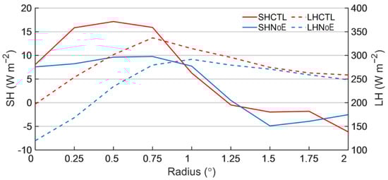 Distribution of sensible heat flux (solid line) and latent heat flux (dashed line) near TC center in the CTL (red line) and the NoE (dashed line).