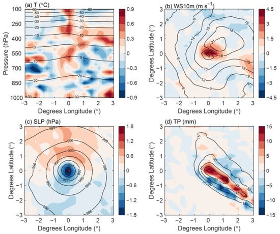 Under the influence of the SST warm anomalies caused by the eddy, the ocean transferred more heat to the atmosphere, providing the TC with additional energy and increasing its intensity [14]. To investigate the spatial distribution of the impact of the eddy on the TC, this study performed a composing analysis of the simulation results during the EP within a composing range of 300 km, which is typically the maximum radius reached by the TC rainbands. Figure 7 (shaded) shows the patterns of differences between CTL and NoE. Due to the convergence of warm water by the eddy, the high heat flux region is concentrated within a radius of 100 km from the TC center (Figure 6), and the corresponding warmer air above the TC center are also within this range (Figure 7a). In the CTL there is an obviously convex in the isotherm near the TC center. Compared to the results of NoE, the increase in temperature from 850 hPa to 100 hPa is more significant. The warm core structure is one of the most significant characteristics of TCs, and during TCs’ development, the warming of air is often be found in its upper atmosphere [54]. In the development process of a TC, the upper-level warm core has a more significant impact on reducing the sea surface pressure compared to the lower-level warm core [55]. According to the analysis of the high-altitude warm core in a case of TC, Wang et al. (2013) [56] suggested that the warm core formed by the increased upper atmospheric temperature caused by intense convection can enhance the rapid development of TCs. In the CTL, the stronger vertical convective mixing leads to more downward momentum transfer in this range, and the surface wind speed increases (Figure 7b). The variation of SLP is also concentrated near the TC center (Figure 7c), but its proportion of variation is smaller than that of wind speed. This indicates that during this process, vertical mixing plays a dominant role, and the effect of pressure adjustment is slightly weaker. During the EP, TC moves towards the north-west direction, so the precipitation caused by TC is within a band approximately 100 km wide to the southeast of the TC center in the composing results (Figure 7d). The precipitation in the CTL is 5–15 mm larger than that in the NoE within this band, while on both sides of this band, the precipitation in the CTL relatively less. This phenomenon may be attributed to the enhanced evaporation resulting from the increased SST in the region outside the eddy core after SST smoothing.