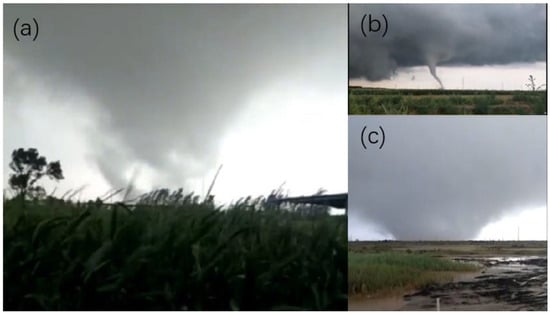 Funnel clouds caused by tornadoes were captured by meteorologists in (a) Mashihe village, Yanghu Town, Yangxin County, Binzhou City (117.40° E 37.53° N), (b) Tandong village, Yanwo Town, Lijin County, Dongying City (118.44° E, 37.68° N) and (c) Nanwang village, Liuhe street, Hekou District, Dongying City (118.47° E, 37.86° N) Available online: https://weibo.com/p/1005051763864272/home (accessed on 15 August 2022).