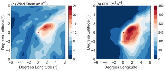 Composites of surface to 3 km (a) wind shear and (b) SRH near TC Center (red spot) during tornado generation period in ERA-5 data.