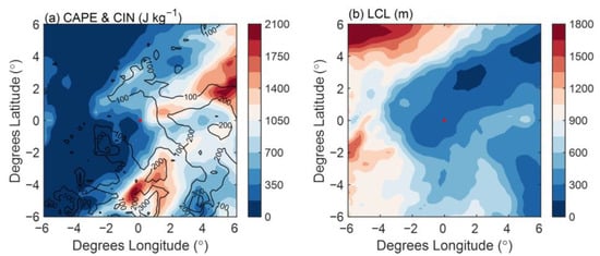 where represents the level of free convection. represents the equilibrium level. represents the virtual temperature of the lifted parcel. represents the virtual ambient temperature. represents the gravitational acceleration. Figure 10a shows the CAPE near TC center calculated from ERA5 data. The area of high CAPE values is located north-east and south of the TC center, with a maximum value of 2100 J kg−1. The CAPE calculated from the sounding data near TC tornadoes at 12:00 UTC on 13 August (00:00 UTC on 14 August) is 1746 (1230) J kg−1. Although the CAPE value in the north-east quadrant was not high due to the low atmospheric pressure caused by the weakened TC, it also had the conditions for generations of tornados. The convective inhibition energy in the northern part of the TC was generally low, typically below 100 J kg−1. The calculated convective inhibition energy from the sounding data was only 10 and 76 J kg−1. This indicated that convection could effectively develop in the area where tornadoes generated. Additionally, the lifting condensation level of the TC center and its north-east area was relatively low (below 200 m), which was also conducive to tornados generations (Figure 10b).