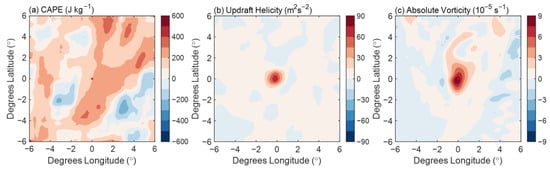 Miglietta et al. (2017) investigated the effect of SST on tornadoes generated at sea by conducting WRF experiments to alter SST [61]. The results indicate that variables such as CAPE, updraft helicity, absolute vorticity, etc., that characterize thermodynamic conditions around the tornado increase with the increase of SST (Figure 11), which is beneficial for the generation and development of tornadoes. Although the ocean did not directly affect the tornadoes during this case, the eddy could influence the formation of TC tornadoes by affecting the TC. Model experiments was used here to show the conditions differences around the TC. In the CTL, within a radius of 600 km from the center of the TC, especially in the northeast direction, the CAPE is significantly larger, with better thermal conditions for convection. The differences in dynamic conditions are mainly manifested at the center of the TC, with a radius of 200 km. In this case, 75% of TC tornadoes generated within 200 km north-east of Yagi’s center, therefore, the presence of the eddy was more conducive to the generation of TC tornadoes.