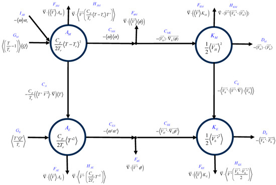 The set of atmospheric energetics equations suitable for storms studies is summarized in Figure 2. This diagram is a combination of Equations (24)–(27). Unlike the climate energy cycle (Figure 1), we note that in this transient eddy energy cycle, there are the third-order conversion terms and , (made of products of three time variability variables), which are usually negligible in practice.