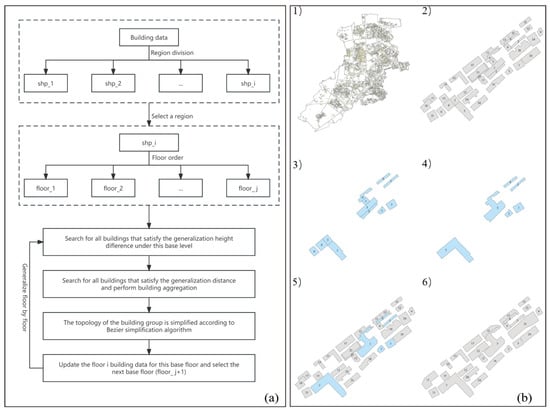 Generalization in this study refers to merging buildings with similar distances and heights into a building group with a unified height using three generalization parameters (the height difference between buildings, distance between buildings, and tolerance of topological simplification of the buildings). The topology of the merged buildings was simplified, and the complexity of the generalized building group model was reduced. The building vector layer in the ESRI shapefile (shp) format contained spatial and attribute information on the buildings. The two-dimensional building clusters were generalized using GIS analysis. Subsequently, a three-dimensional building cluster model was generated. The objective was to reduce the number of buildings and model complexity while preserving the wind flow field. The generalization workflow is depicted in Figure 2. (1) To avoid inappropriate merging of buildings on opposite sides of the roads, we initially divided the study area into multiple zones (e.g., shp_1, shp_2, shp_3... shp_i) based on the administrative boundaries and major roads in the study area. (2) One of the zones, shp_i, was selected for the generalization. (3) The floors were ranked to ensure uniformity for the building heights. The frequencies of the number of floors in buildings in shp_i were ranked in descending order. All buildings that met the vertical generalization parameters were selected based on the floor height. For instance, if the most common floor height in the zone was 3 m, and the vertical generalization parameter was 3 m, then all buildings with heights ranging from 3 m to 6 m were selected for generalization. (4) The selected buildings satisfying the horizontal generalization parameters were consolidated and merged into a new building with the assigned basic floor height. In this example, the horizontal generalization parameter was 5 m. Thus, all buildings within a distance of less than 5 m were merged. (5) The bend simplification algorithm was chosen to simplify the results from step 4. This algorithm defines the maximum angle that can be considered a straight line in a polygon based on a bend threshold. If the angle between each pair of adjacent line segments is below the threshold, then they are joined to form a new curve approximating the original line segment [28]. This algorithm produces fewer sharp angles than other polygon simplification algorithms. This step eliminates small curvatures at the building boundaries, preserves polygon shapes, reduces the vertex count, and decreases computational complexity and storage space. In this example, we used a topological tolerance of 10 m, and the simplified results were applied to the aggregated buildings after step 4, completing the generalization of floor_i. (6) The generalization was performed for each floor in each zone. The results from step 5 were replaced with the original zone’s building representation, serving as the new baseline layer. Steps 3–6 were repeated in the next floor generalization. For instance, if the next height of floor_2 was 9 m, then all buildings with heights from 6 m to 12 m were selected. This process continued until all floors were generalized. The same steps were applied to the next zone. (7) The last step involved consolidating the results obtained from the zone-by-zone generalization to achieve a generalization representation of the study area.