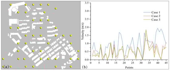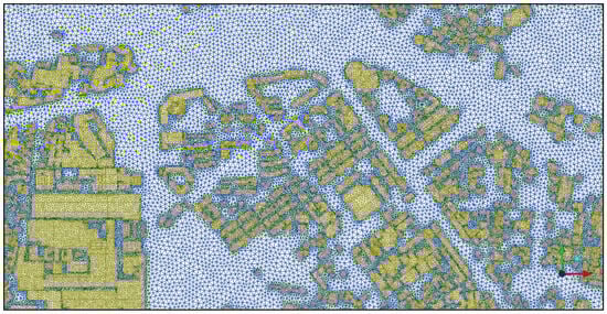 Due to the complex building distribution, we used unstructured grids for meshing to enhance the adaptability to boundary flow fields with complex shapes and facilitate the refinement of areas with large changes in building geometry. We selected three grid sizes to test the grid sensitivity (Table 1). Due to the large size of the study area and limited computational resources, we chose to test a small area rather than the entire study area. A total of 45 reference points were selected to compare wind speeds at a 1.5 m height for different cases, as shown in Figure 4. The wind speeds of the reference points for Case 2 and Case 3 were only slightly different. The wind speed correlation between Case 1 and Case 2 was 0.48, and that between Case 2 and Case 3 was 0.94. Since we analyzed the wind environment of the entire street, Case 2 and Case 3 were applicable to the study area. However, the number of grids for the entire city was too large when the grid size was the same as that in Case 3 and exceeded the computer limit. Therefore, the maximum grid size was set to 80 m for the global element, 20 m for the ground, and 6 m for the buildings. Although most meshes were in the recommended range of 30–10,000 for y+ [30], some meshes deviated from this range due to limited computer resources and complex computational domain surfaces. Since y+ is often not defined in practice, the grids were not redivided in this study. Figure 5 is a schematic diagram of the grid used in the study area.