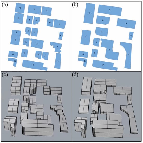 Since 62.35% of the building area fell within 150 m2 ± 50 m2, 98.64% of the building floors were 30 m and below. Therefore, we used a model length of 15 m and a width of 10 m for the generalization parameter selection in the vertical direction. We assessed 10 building heights (3–30 m at intervals of 3 m) to select the vertical generalization parameters.