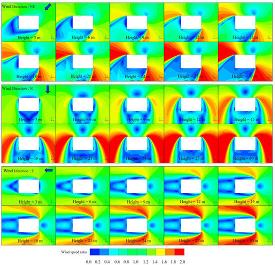 CFD wind environment simulations were performed for different building heights. The wind speed ratios at the pedestrian height (1.5 m) for three incoming winds (northeast, north, and east) are depicted in Figure 7. In general, the wind speed ratio increased as the building height increased, and the rate of increase was larger for taller buildings. The main reason for this is that the wind speed on both sides of the building increases with the building height. In addition, the spatial distribution of the wind speed ratio around the buildings is more similar for taller buildings. For example, the wind speed ratio exhibited greater consistency at building heights of 3 m and 6 m. However, there were notable differences in the wind speed ratio between the 30 m buildings and shorter buildings.