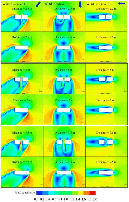 The average wind speed ratio difference was 0.0252 for a building height difference of 3 m, 0.0539 for a building height difference of 6 m, and 0.0797 for a building height difference of 9 m. The difference in the wind speed ratio was the largest when the incoming wind direction was north (i.e., perpendicular to the building’s direction), followed by the wind direction at a 45° angle to the building’s direction and the incoming wind direction parallel to the building’s direction.