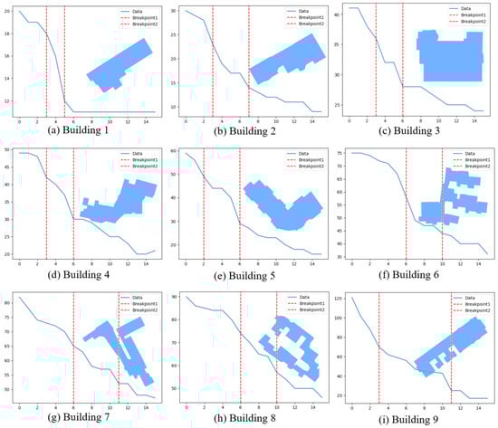 Topological generalization is performed after vertical and horizontal generalizations because multiple buildings have been aggregated into a new building. Topological generalization is performed to reduce the redundant nodes of the new buildings. Here, buildings with more than 20 sides were regarded as objects that required topological generalization. Ten sides were used as intervals for classification (those with more than 100 sides were unified into one category), and a building was extracted. We extracted one polygon from each category and performed topological generalization with a range of 1–15. Figure 9 shows that the number of nodes decreased as the generalization parameter increased. We used dynamic programming to analyze the breakpoints and observe six instances at a topological parameter of 6 m. This result indicates that the change in the number of building nodes was negligible after reaching a topological tolerance of six. Therefore, 6 m was chosen as the parameter value for the topological generalization.