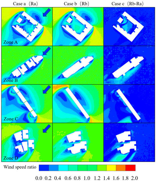 Figure 12 compares the spatial distribution of the wind speed ratio at the pedestrian height (1.5 m) before and after the generalization of four buildings with typical layouts (enclosed building layout, building layout parallel to the incoming wind direction, building layout perpendicular to the incoming wind direction, and mixed building layout). Case A represents the distribution of the wind speed ratio before generalization, Case B represents it after generalization, and Case C represents the difference in the wind speed ratio between Case A and Case B. The average wind speed of the building groups in the four layouts was slightly higher after generalization. The average wind speed ratio of the enclosed layout (Zone A) was 1.31 before generalization and 1.32 after generalization. The largest difference in the wind speed ratio occurred between the interior of the building clusters and the original building. The wind speed inside the building group was relatively stable after generalization, and the wind shadow area was smaller than it was before generalization. The average wind speed ratio of Zone B, a building group parallel to the incoming wind direction, was 1.23 before generalization and 1.24 after generalization. The wind shadow area between the buildings was significantly lower, and the wind speed ratio was slightly higher after generalization. Zone C, a building group perpendicular to the incoming wind direction, had the highest wind speed ratio. The average wind speed ratio was 1.38 before generalization and 1.41 after generalization. The wind shadow area was significantly different after generalization. The wind flowed between the buildings before generalization but was blocked by the building after generalization, substantially changing the shape of the wind shadow area. The average wind speed ratio of the mixed layout (Zone D) was 1.22 before generalization and 1.24 after generalization. In this case, the wind speed ratio of the building cluster was slightly higher after generalization than before generalization. After generalization, the mixed buildings tended to be parallel to the incoming wind direction. Therefore, the tunnel effect was more pronounced after generalization.