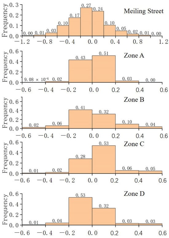 We compared the wind speed before and after the generalization of the whole study area and extracted the wind speed at reference points at the same distance for the four layout scenarios at a height of 1.5 m. The results are illustrated in Figure 13. It is noteworthy that the frequencies were normally distributed in all five cases. The maximum difference in the wind speed at the reference points before and after generalization was 1.2 m/s on Meiling Street, and the difference in wind speed within 0.2 m/s accounted for more than half of it. The maximum wind speed difference for the four layouts was 0.6 m/s. The difference in the wind speed before and after generalization was the smallest in Zone A, with 94% being within 0.2 m/s. In contrast, the difference was the largest in Zone B, being only 73% within 0.2 m/s. The proportions were similar for Zones C and D. However, 64% of the reference points in Block C had higher wind speeds after generalization, whereas 58% of the points in Block D had lower wind speeds. The differences in wind speed before and after generalization were within 0.2 m/s for more than half of the reference points in the five cases, indicating a minimal error in the wind speed.