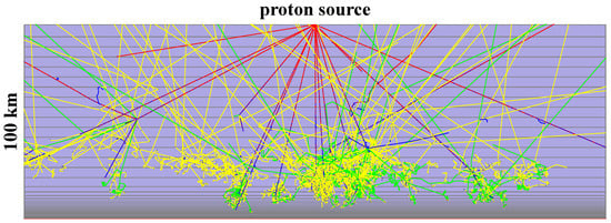 To implement the physics of elementary particles’ interaction with matter, the models of standard electromagnetic processes included in GEANT4, the model of Bertini cascade [], the Quark-Gluon string model [,], and the high-precision model for neutrons are used []. The model generator of primary particles is specified as a point source at the top of the Earth’s atmosphere (100 km). The probability density for choosing the primary particle energy is set in accordance with the energy spectrum of the primary protons. For GCRs, such a spectrum is determined using the technique described in GOST 25645.104-84 “Cosmic rays. Terms and definitions (1985)” for solar protons during GLEs—according to the method defined by [,], for SEP events—as described in the results of the current work. Visualization of the passage of protons with an energy of 5 GeV and the creation of cascades of secondary particles is presented in Figure 1.