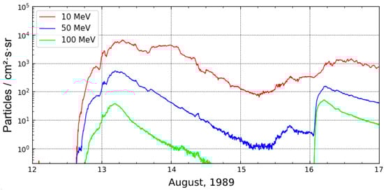 The first of the events under consideration is mentioned in the paper by []. The authors consider that the sharp increase and first peak in the flux of protons of different energies observed early on 13 August 1989 (see Figure 2) do not have an established source (solar flare or interplanetary shock responsible for such a SEP event), but the source of the second peak (which occurred on the evening of 13 August) is the X2.6 solar flare that happened on 12 August at 13:57 UT (S16W37 in AR 5629).