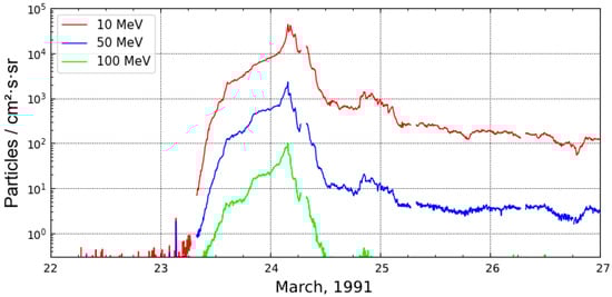 This event was associated with the X9.4 solar flare (S26E28, AR 6555) on 22 March 1991 at 22:43 UT. A sharp increase in fluxes of protons of different energies from the background level began in the first half of the day on 23 March and reached maximum values with the arrival of a shock wave from the corresponding interplanetary disturbance in the first hours of 24 March. Particle flux profiles for the period 22–26 March 1991 according to GOES satellite data are shown in Figure 3. The maximum proton fluxes were P10 = 43,000 pfu, P50 = 866 pfu, and P100 = 100 pfu. According to the catalog [], this event could also have an additional contribution from a flare that occurred several hours later from the above-mentioned one in the same active region (M6.8 at 03:05 UT on 23 March).
