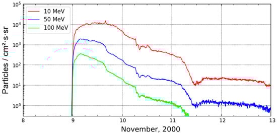 Figure 4 shows the behavior of different energies of proton fluxes during the period 8–12 November 2000. According to El-Borie [] and the catalog by Logachev et al. [] this event is the largest in terms of peak values of SEP fluxes in the 23rd solar cycle. Maximum particle fluxes were recorded in the first 4–8 h and were P10 = 14,800 pfu, P50 = 1580 pfu, and P100 = 451 pfu. The solar flare M7.4 (N10W77, AR 9213) that caused this proton flux enhancement occurred at 22:42 UT on 8 November and the associated coronal mass ejection (at 23:06 UT with an initial speed of 1738 km/s) became a source of interplanetary disturbance, registered near the Earth’s orbit on 10 November at 06:28 UT.