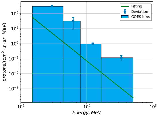 The GOES data used for differential spectra are provided in the form of energy-binned spectra. The first bin has a range of 15–44 MeV (29 MeV width), the second has 44–80 MeV (36 MeV width), the third has 80–165 MeV (85 MeV width), and the fourth has 165–500 MeV (335 MeV width). In the differential spectra data, a fixed value is relevant to each energy bin. The task was to define such a dependence that provides the best concordance with the experimental data. In order to achieve this, a power-law relation was used as the first approximation. Note that determining the real spectrum is a complex problem, and it will be considered in future works. This is because depending on the event characteristics, the spectrum can be expressed not only in a power-law relation but also, for instance, in an exponential one. The polynomial approximation does not currently seem to be appropriate since four experimental data points are insufficient, and the resulting spectrum shape may be a strong misrepresentation. Finding the minimum value for the sum of squared deviations from the experimental data for all four bins was a choice criterion for the best coefficient a and the degree γ of F(E) = a∙E−γ dependence. That is, using own program, a set of a and γ combinations was sampled, the integral for four intervals as well as the sum of squared deviations were calculated and the best value was chosen at the final stage. Figure 6 shows an example of the obtained spectrum with the specified deviation intervals. It is clearly seen that deviations from the second and fourth channels are significant and the solution of this problem is the subject of future research.