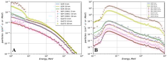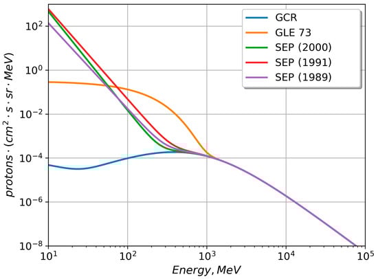 For the GLE 73 event, the spectra were calculated according to the technique described in [] and extracted for the moment with the hardest spectrum. It should be noted that this work implies the calculations for the atmospheric region, where the geomagnetic cutoff rigidity allows particles with energies E > 10 MeV to penetrate the boundary of 100 km in polar regions. This is because the largest fluxes are observed in proton energies with the order of tens MeV for SEP events. Therefore, the lower energy threshold in the spectra corresponds to a value of 10 MeV. The extension of the obtained spectra to a high-energy part is performed assuming that GCR protons are always present in this spectrum. As was mentioned above, since SCR protons are responsible for the spectrum part with E < 1 GeV, then the part E ∈ [1 GeV,100 GeV] is defined according to the GOST 25645.104-84 Cosmic rays; Terms and definitions (1985). All spectra with the inclusion of the GCR high-energy part are presented in Figure 7.