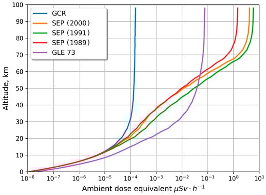 As can be clearly seen from the table, during the considered SEPs, the value of the ambient dose equivalent is practically no different from the GCR for altitudes intended for flights of civil aircraft. For the GLE event, these values can be several times higher and affect the dose received by the crew and passengers. For SEPs, a significant difference in the ambient dose equivalent value is observed in the altitude range from 20 to 100 km and can reach several orders of magnitude, which, in turn, can affect, e.g., atmospheric chemistry [].