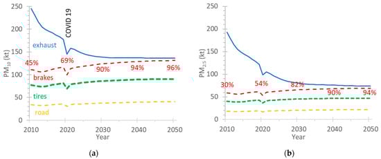Evolution and projections of exhaust, non-exhaust (brake, tire, and road wear), and total PM emissions from road transport in EU27 []: (a) PM10; (b) PM2.5. Percentages give contribution of non-exhaust to total PM at years 2010, 2020, 2030, 2040 and 2050. The decrease of emissions in 2020 was due to the COVID-19 restrictions.