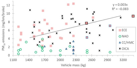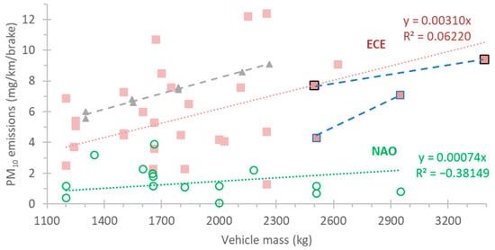 In general brake wear and kinetic energy change or brake dissipation energy are correlated [,,,]. For the same braking events (i.e., cycles), the brake wear should correlate with the load (vehicle mass). The impact of vehicle mass on the brake emissions has been mentioned in previous studies, but has not been quantified (see review [,]). Figure 2 summarizes the data of Table 2 (red squares for ECE pads, open green circles for NAO pads) with the addition of three studies that examined the impact of mass on brake emissions for a passenger car (grey triangles, []), and two vans (large squares with black borders [] and blue borders [] connected with dotted blue lines for better visualization). Only gray cast-iron discs data were used (i.e., coated discs or drum brakes were not considered). As expected, the dedicated studies show a linear correlation (see grey triangles), but the slope is not the same for all studies. However, when considering all brakes, the results of Table 2 indicate no correlation for ECE or NAO pads, because any correlation is masked from the material impact on the emissions. For all ECE pads the average correlation factor is 3.1 mg/km/brake per 1000 kg of vehicle mass (note the low R2 value).