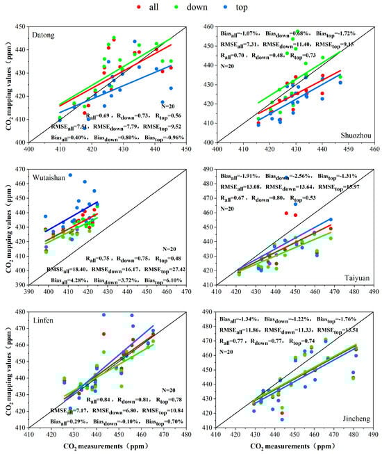 Comparison of CO2 mapped values at different trajectory calculation altitudes with the seasonal averages of the in situ information at the six stations in Shanxi from 2016 to 2020. (The black line represents the 1:1 line. The differently colored dots denote different trajectory altitudes, with red dots indicating all altitudes reachable by the trajectory model (the “all” group), green dots indicating altitudes below 2 km (the “down” group), and blue dots indicating altitudes above 2 km (the “top” group). The variable N represents the total number of data, with 20 data points in total over five years. Rall, Rdown and Rtop denote the correlation coefficients of the mapped values’ trajectory calculation altitude to the in situ information at corresponding trajectory calculation altitudes. When N = 20, α = 0.001, Rxt = 0.652; α = 0.01, Rxt = 0.537; α = 0.1, Rxt = 0.360 []. RMSEall, RMSEdown and RMSEtop represent the root mean square errors (RMSEs) of the mapped values at corresponding trajectory calculation altitudes with the online observations. The values range from 0 to +∞, and the values closer to 0, indicate a more perfect fit. Biasall, Biasdown and Biastop are the relative biases of the mapped values at corresponding trajectory calculation altitudes with the online observations, and the values closer to 0 indicate a more perfect fit).