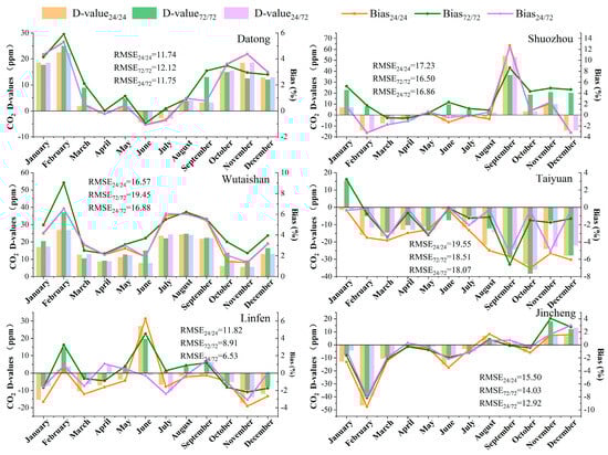 Comparison of CO2 mapped values under different trajectory calculation durations with the monthly averages of the in situ information at the six stations in Shanxi in 2017. The orange, green and purple bar charts correspond to D−value24/24, D−value72/72 and D−value24/72, respectively, which indicate the differences between the CO2 mapped values at corresponding trajectory calculation duration and the in situ information. The orange, green and purple line charts correspond to Bias24/24, Bias72/72 and Bias24/72, respectively, representing the relative biases of the mapped values at corresponding trajectory calculation duration with the in situ information. Similarly, RMSE24/24, RMSE72/72, and RMSE24/72 represent the root mean square errors of the mapped values at corresponding trajectory calculation duration with the in situ information.