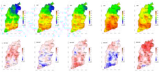 Based on the 5-year online observed CO2 concentrations from the six stations, the trajectory-mapped spatial domain-filling technique is utilized to map the data from the six stations onto the entire Shanxi Province, thus deriving the distribution characteristics of the CO2 concentration across the province. The relevant parameter settings are in accordance with the results in Section 3. That is, the trajectory calculation altitude is set to less than 2 km, and the forward and backward trajectory calculation durations are set to 24 h and 72 h, respectively. Table 2 shows the average, maximum and minimum CO2 concentrations in Shanxi Province and each city from 2016 to 2020 in comparison with the global CO2 concentration and those at the background stations, and it also demonstrates the annual variation rate of CO2 concentration at each station during the 5-year period. The Waliguan global atmospheric background station serves as a representative of the background level of atmospheric CO2 in the Eurasian hinterland, while the Shangdianzi regional atmospheric background station represents the background level of CO2 concentration in North China []. Figure 4 illustrates the distribution of CO2 concentrations in the 11 cities across Shanxi Province from 2016 to 2020, along with the annual variations in CO2 concentrations in the entire province during the 5-year period.