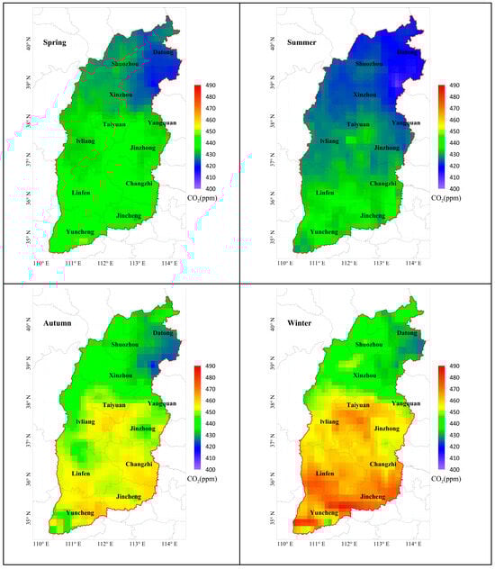 The seasonal amplitudes of the CO2 concentration in spring, summer, autumn and winter are 30.5 ppm, 33.1 ppm, 46.8 ppm and 59.4 ppm, respectively, and the amplitudes in spring and summer are smaller than those in autumn and winter. Throughout all four seasons, the CO2 concentration increases from the north to the south. In the northern regions, especially in northeastern Xinzhou, the CO2 concentration remains at a relatively low level throughout the year, with a smaller seasonal amplitude of around 20 ppm. In contrast, the southern-central regions exhibit a relatively higher CO2 concentration throughout the year, with a larger seasonal amplitude of around 30 ppm. This finding is consistent with most previous studies in mid-latitude regions [].