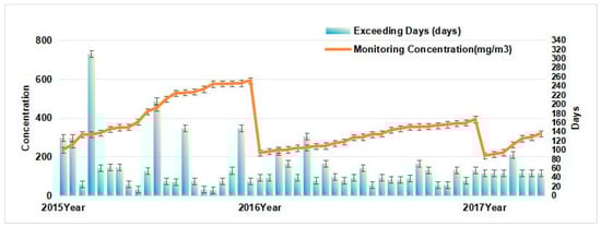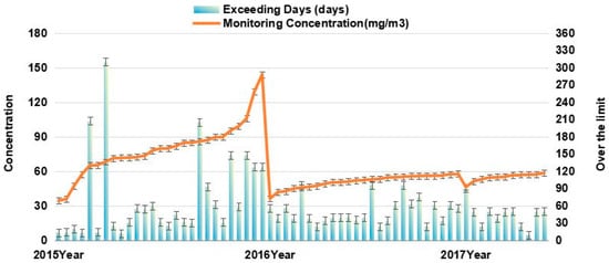 The data presented in Table 2 illustrate the variations in particulate matter emissions by the chemical company from 2015 to 2017 (Figure 1). The data indicate that in 2015, there were several months with extremely high concentrations of particulate matter, especially towards the end of the year, where the concentration exceeded 80 mg/m3 multiple times, far beyond the stipulated 30 mg/m3 standard. In 2016, although the overall particulate matter concentration decreased compared to 2015, several months later, the standard limit was still exceeded. As of 2017, despite a reduction in particulate matter concentration, instances of exceeding the limit persisted, indicating that while the company has improved in controlling particulate matter emissions, the effectiveness remains suboptimal.