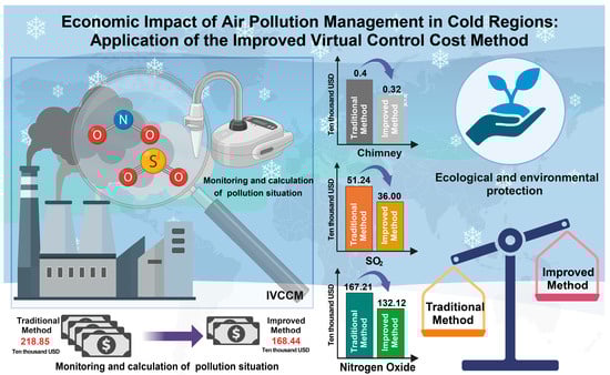 Using a case study of a company primarily producing methanol and coal-based natural gas, this paper applies the IVCCM to assess the environmental damage caused by excess particulate matter, sulfur dioxide, and nitrogen oxides emitted from the company’s boiler exhaust during specific periods. Through adjustments of calculation coefficients and considerations of the ecological characteristics of cold regions, the study accurately calculates the losses due to pollutant emissions [,,]. The specific methodologies involve collecting emission data from the company during different periods, employing segmented counting methods, and comprehensively recording and analyzing shutdown and startup times. Subsequently, key parameters in the Virtual Control Cost Method are adjusted based on the climate conditions of cold regions to align with reality. Finally, by calculating the virtual costs of controlling different pollutants, the study provides a comprehensive assessment of the total environmental losses caused by excess emissions from the company []. The results indicate that the IVCCM significantly reduces the costs of environmental damage assessments while enhancing the accuracy and reliability of the outcomes.