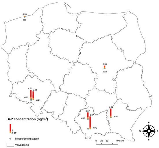 Furthermore, the data clearly demonstrate that the average annual concentrations of BaP in the analyzed HR across Poland significantly exceeded the WHO recommended limit of 0.12 ng/m3. This threshold is established by the WHO to minimize health risks associated with long-term exposure to this carcinogenic compound. Alarmingly high B(a)P concentrations were found in HR such as HR2 at 6.97 ng/m3, HR6 at 4.91 ng/m3, and HR3 at 4.67 ng/m3. These values were over 50 times higher than the WHO’s recommended limit. The data highlight a serious public health concern, as all analyzed locations exceeded the WHO guideline for safe B(a)P levels. Persistent exposure to such elevated concentrations of B(a)P in these HR—which are typically sought after for their clean air and therapeutic environment—could lead to increased risks of cancer and other health problems among the local population and visitors [18,22]. The stark contrast between the observed B(a)P levels and the WHO recommendations underscores the urgent need for targeted interventions to reduce pollution and protect public health in these areas.