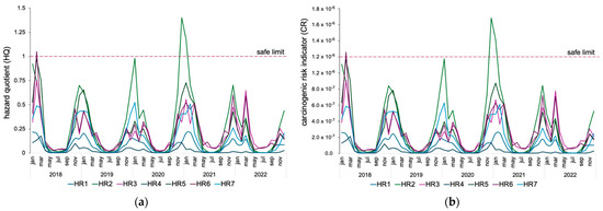 For the patient group, who remained continuously exposed to B(a)P throughout their stay at the resort, the non-carcinogenic risk fluctuated across different months and years (Figure 2 and SM, Table S2). The highest non-carcinogenic risks, as indicated by the HQ, were observed during the winter months, particularly in January. For instance, in January 2020 at HR2, the HQ for patients reached 0.98, and at HR6, it reached 1.18, indicating a risk level that exceeded the threshold of 1, where non-carcinogenic health effects are considered possible. Similarly high values were observed in December 2020, with HQ values around 1.40 at HR2 and 1.18 at HR6, reflecting persistent high-risk periods during colder months. These elevated levels are primarily due to increased heating activities and lower atmospheric dispersion during the colder months, which contribute to higher concentrations of B(a)P [45]. In addition to the overall analysis for patients, a closer examination of non-carcinogenic risks for different age groups—children (2–16 years) and adults (over 16 years)—revealed important distinctions. While the non-carcinogenic risks for children generally remained low throughout the assessment period, certain months and resorts presented elevated risks for adults. For instance, in January 2021, the HQ for adults at HR6 reached 1.18, indicating a significant potential health risk due to prolonged exposure to B(a)P. In contrast, the HQ values for children during the same period and location were substantially lower, typically remaining well below the threshold of concern. However, despite lower HQ values for children, it is important to note that their developing respiratory and immune systems make them more susceptible to even low levels of environmental pollutants [59]. The observed trend in the data suggests that while children are less exposed than adults, they are not completely free from risk. The most recent data from 2022 indicates some improvement, with HQ values for both children and adults showing a downward trend, particularly in the winter months, with a maximum of 0.73 observed at HR5 in January. This suggests that ongoing measures to improve air quality, such as the adoption of low-emission heating technologies, may be starting to have a positive impact on reducing non-carcinogenic health risks across all age groups in HR environments [48,51].