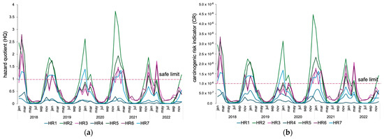 The non-carcinogenic risks included concerning levels of exposure in several HRs (Figure 3 and SM, Table S2). In particular, resorts HR2, HR3, HR5, and HR6 showed HQ values exceeding 1 in multiple instances, especially during the winter months. For example, in HR2, HQ values were as high as 2.47 in January 2018 and 3.74 in November 2020, more than double or triple the safe limit. Similarly, in HR5, the HQ reached 2.60 in February 2018, and in HR6, HQ values peaked at 2.80 in January 2018. These elevated HQ values suggest a significant likelihood of non-carcinogenic health effects, especially during the colder months when resort workers are exposed to higher levels of B(a)P due to increased emissions from individual and collective heating installations using solid fuels. The use of solid fuel stoves, characterized by low energy efficiency and high emissions of pollutants, including particulates and B(a)P, exacerbates this risk [47,63,64]. The primary health concerns associated with such exposures include respiratory issues, such as chronic bronchitis and asthma, cardiovascular problems, and potential impacts on the immune system [16,30,61]. In more recent years, 2021–2022, HQ values for HR workers in HR2, HR3, HR5, and HR6 have shown a downward trend compared to previous years. This trend may reflect improvements in air quality due to the implementation of more effective mitigation measures, such as air protection programs introduced by local authorities in Poland and across Europe, including upgrades to heating systems and stricter emissions controls. For example, in HR2, HQ values in January 2021 dropped to 1.88, which is lower than the value of 2.47 recorded in January 2018. Similarly, in HR5, the HQ in February 2022 was 1.73, a decrease from the value of 2.60 in February 2018. These lower HQ values indicate that the health risk associated with non-carcinogenic exposures may have decreased, although it has not been completely eliminated. Continuous exposure to elevated B(a)P levels can lead to an accumulation of toxic effects over time, potentially worsening pre-existing conditions or contributing to the development of new health issues [65,66]. The data indicate that HR workers are at risk not only during peak pollution months but potentially throughout the year if air quality management is not consistently maintained.