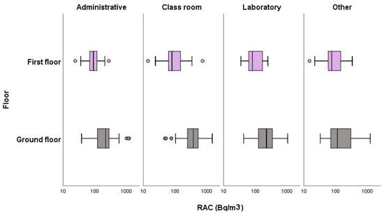 An increase in the floor level of the analyzed rooms is associated with a decrease in the ARAC. The measurements made in the basement yielded a geometric mean of 342 Bq/m3, a value of 212 Bq/m3 being computed for the ground floor, while on the first floor the geometric value dropped to 89 Bq/m3. When data were analyzed globally, they did not follow a log-normal distribution, being at the significance threshold (p = 0.046). However, when data were analyzed according to the building level, a log-normal distribution was obtained only for measurements made on the first floor (p = 0.12). The MW statistical test was employed to compare the data collected at the ground level and on the first floor. The radon measurements carried out in the basement were neglected due to the small number (10). The median ARAC value at the ground level was significantly higher than that on the first floor (p < 0.001). Ivanova et al. reported a comparable decrease in the RAC as the floor level increased in their study, which aimed to monitor the RAC in 331 rooms from 16 schools in Bulgaria [11].