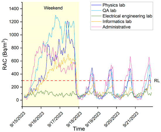 The temporal variation of RACs depending on the monitored room in a high school. The yellow background indicates the weekend period, while the dash line represents the reference level (RL).