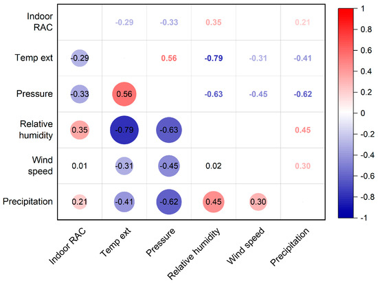Correlation matrix between the indoor RAC and the meteorological factors monitored in the outdoor air.