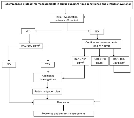 Since 63 out of the 134 measurements conducted in this study fall <100 and >350 Bq/m3, applying this proposal involves conducting long-term, integrated measurements for only half of the targeted buildings. As such, by implementing these tailored approaches, a faster identification process can be carried out in public buildings regarding radon exposure, allowing for the implementation of radon remediation measures in the building renovation plan. Figure 5 shows the proposed protocol.