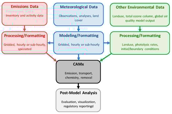 CAMx comprises the core component of an integrated air quality modeling system (Figure 1). As a stand-alone “off-line” model, inputs of space- and time-resolved meteorology, emissions, surface topology, and initial/boundary conditions are developed using independent third-party models and processing tools. Interface programs are needed to translate the products from each of these sources into the specific input fields and formats required by CAMx. After an air quality simulation is completed, additional post-processing programs manipulate raw concentration and deposition output fields for evaluation, visualization, and regulatory analyses.