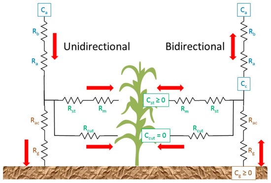 Schematic of surface deposition and emission pathways showing applicable resistances (R) following an electric circuit analog. The left side shows the standard Zhang unidirectional deposition scheme []; the right side shows the Zhang bidirectional NH3 scheme [,] with NH3 compensation points (C).