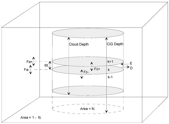 Schematic of CiG within a single CAMx multi-layer grid column (outer box), indicating CiG cloud volume (cylinder), area coverage (fc), ambient and in-cloud vertical fluxes (Fa, Fc), and entrainment/detrainment fluxes (E, D). Vertical layer depth and indexing are noted with dz and k.