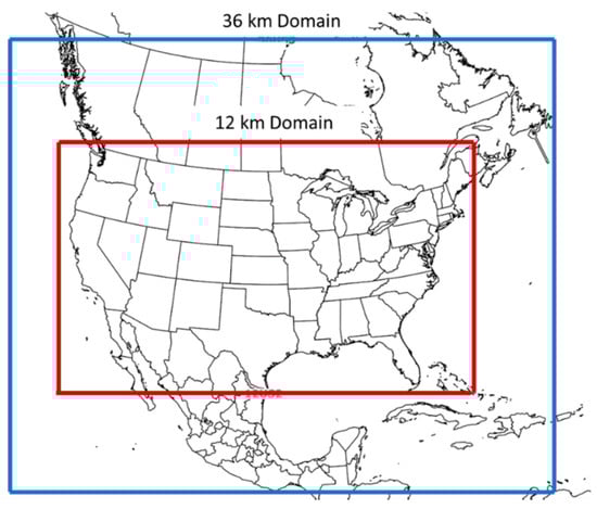 CAMx includes an optional sub-grid cloud framework (Cloud-in-Grid or CiG) that explicitly simulates in-cloud shallow mixing, deep convective transport, aqueous chemistry, and wet scavenging below the grid scale []. All processes are driven by output fields generated by the WRF Multi-Scale Kain-Fritsch (MSKF) cumulus parameterization [,,,,]. This yields a consistent cloud-mixing-chemistry system across the WRF and CAMx models. Without the CiG invoked, CAMx ignores cloud convective transport and treats all cloud processes at the grid resolution, where diagnosed sub-grid cloud fields are used to parametrically influence grid-scale photolysis rates, wet deposition, and aqueous chemistry.