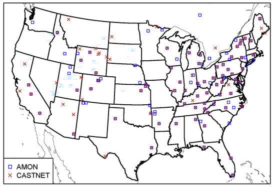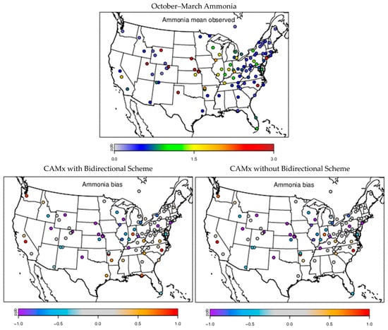 CAMx assigns the land use-specific emission potentials reported by Whaley et al. []. Emission potentials are set to zero if the Leaf Area Index (LAI) is less than 0.5 or if the ground is covered by snow; thus, there is no capacity for emissions from low-vegetation land cover. NH3 emission fluxes calculated from agricultural land use categories are also set to zero on the basis that NH3 emission inventories often explicitly include fertilizer application and thus the bidirectional scheme would potentially double-count NH3 emissions.